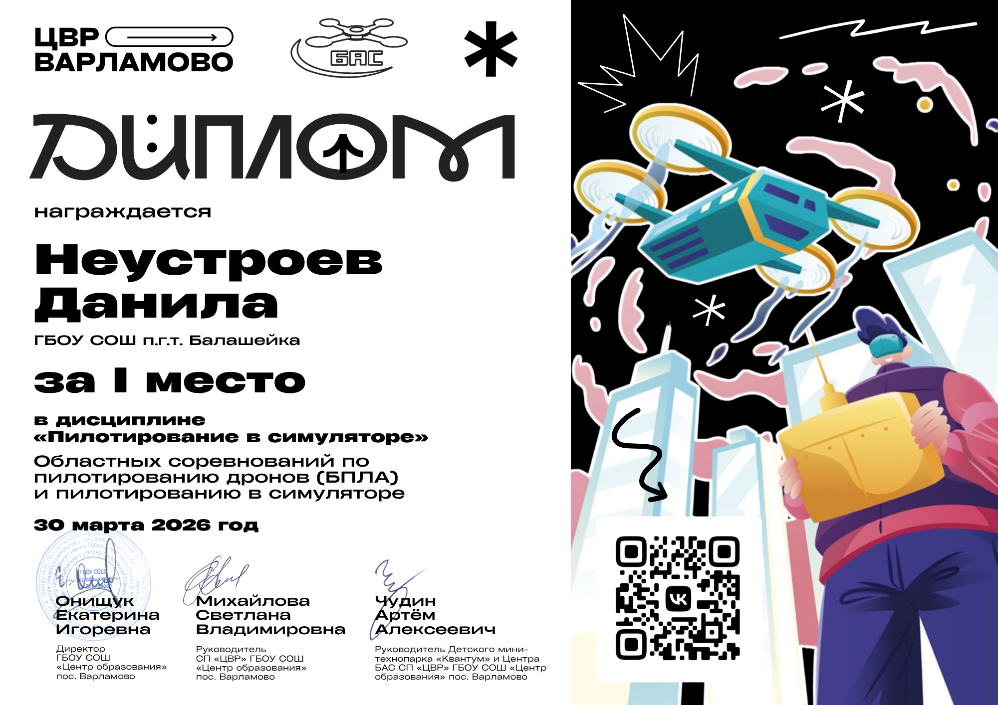 30 марта 2026 года на базе «Центра внешкольной работы» пос. Варламово и Центра БАС успешно прошли Областные соревнования по пилотированию дронов (БПЛА) и пилотированию в симуляторе. В соревнованиях приняли участие представители 18 образовательных организаций. Всего в соревнованиях приняло участие 87 человек. По итогам соревнований ученики нашей школы заняли следующие места: